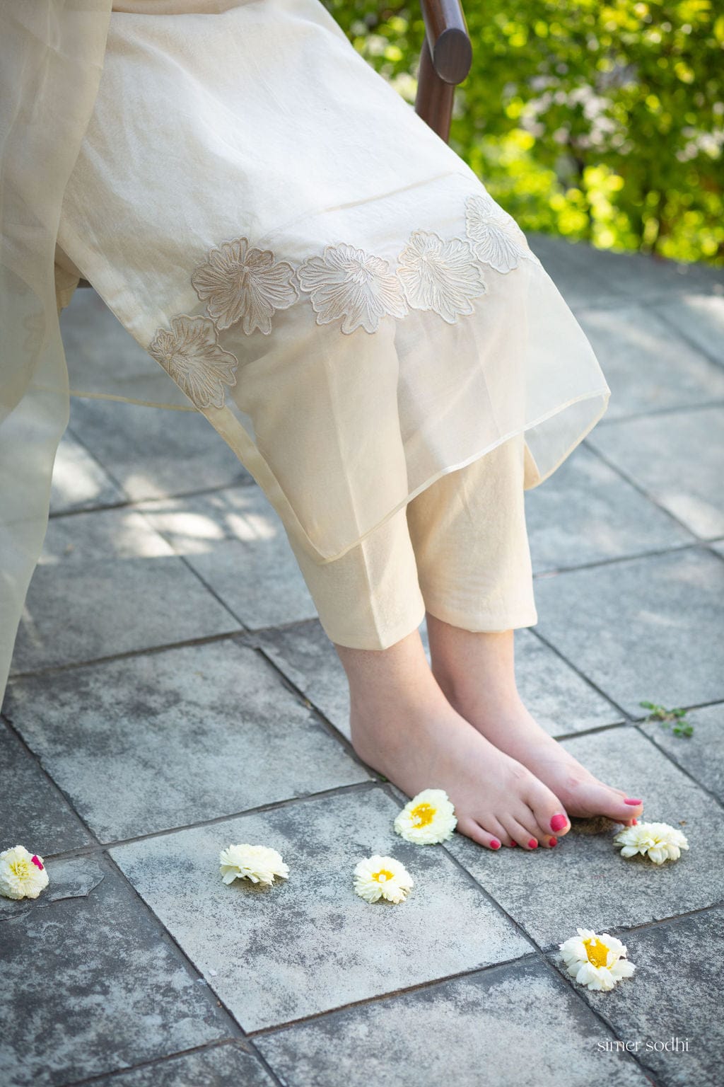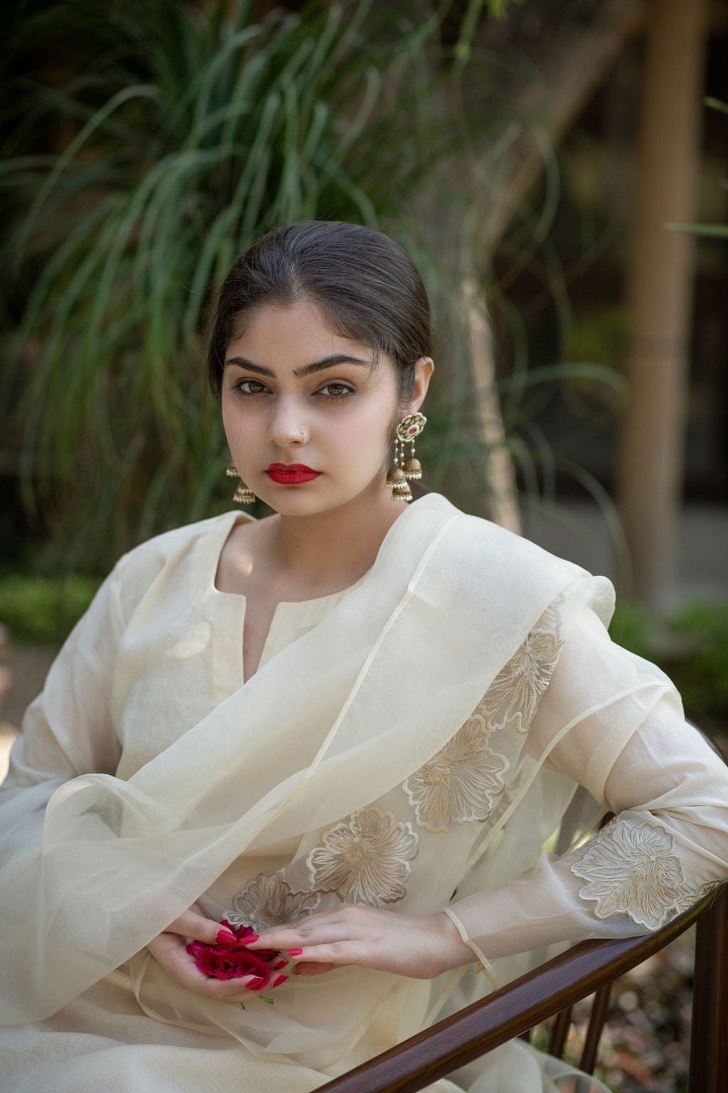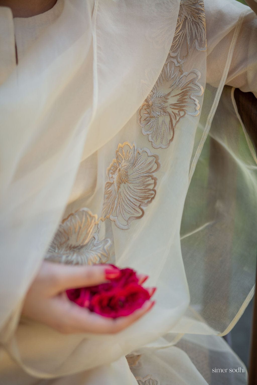 Cream Chanderi floral resham embroidered shirt with organza hem on sleeves and ghera