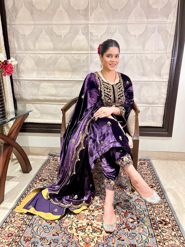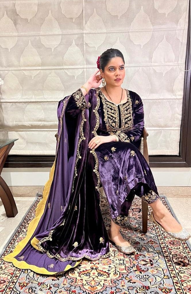 Deep Purple Silk Velvet Suit with Velvet Odhni