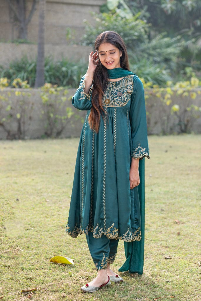 Kalidaar crepe kurta with embroidery on neck, sleeves, kalis and hem of kurta