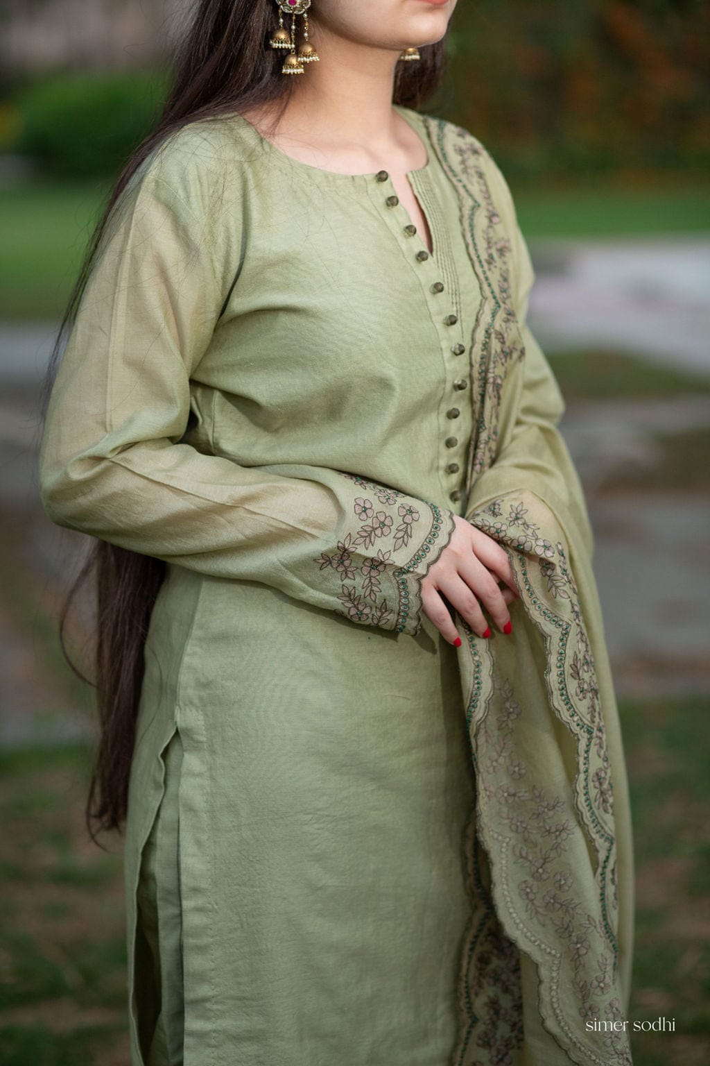 Green Chanderi embroidered shirt