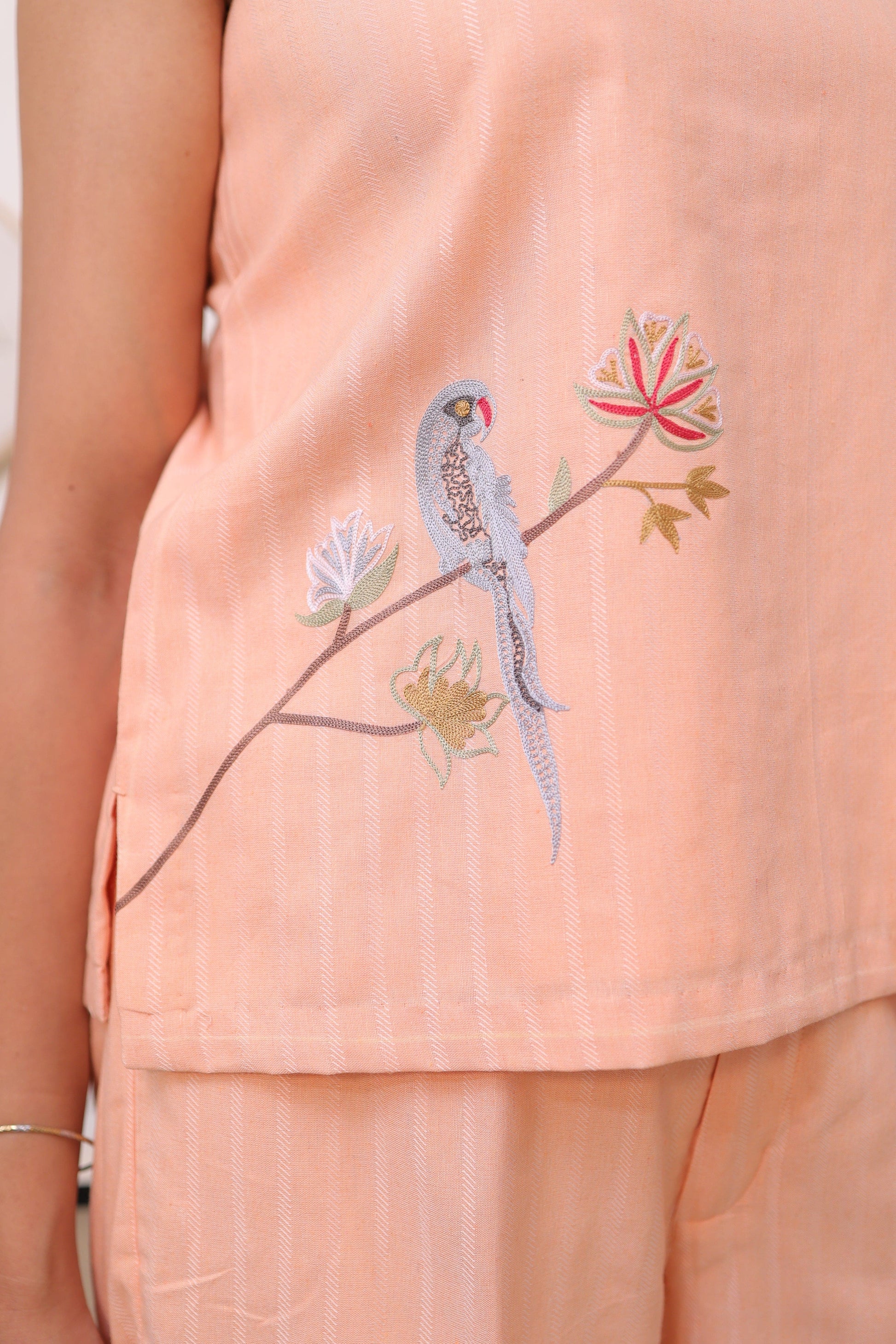 Peach sleeveless Bird Embroidered top in 100% cotton