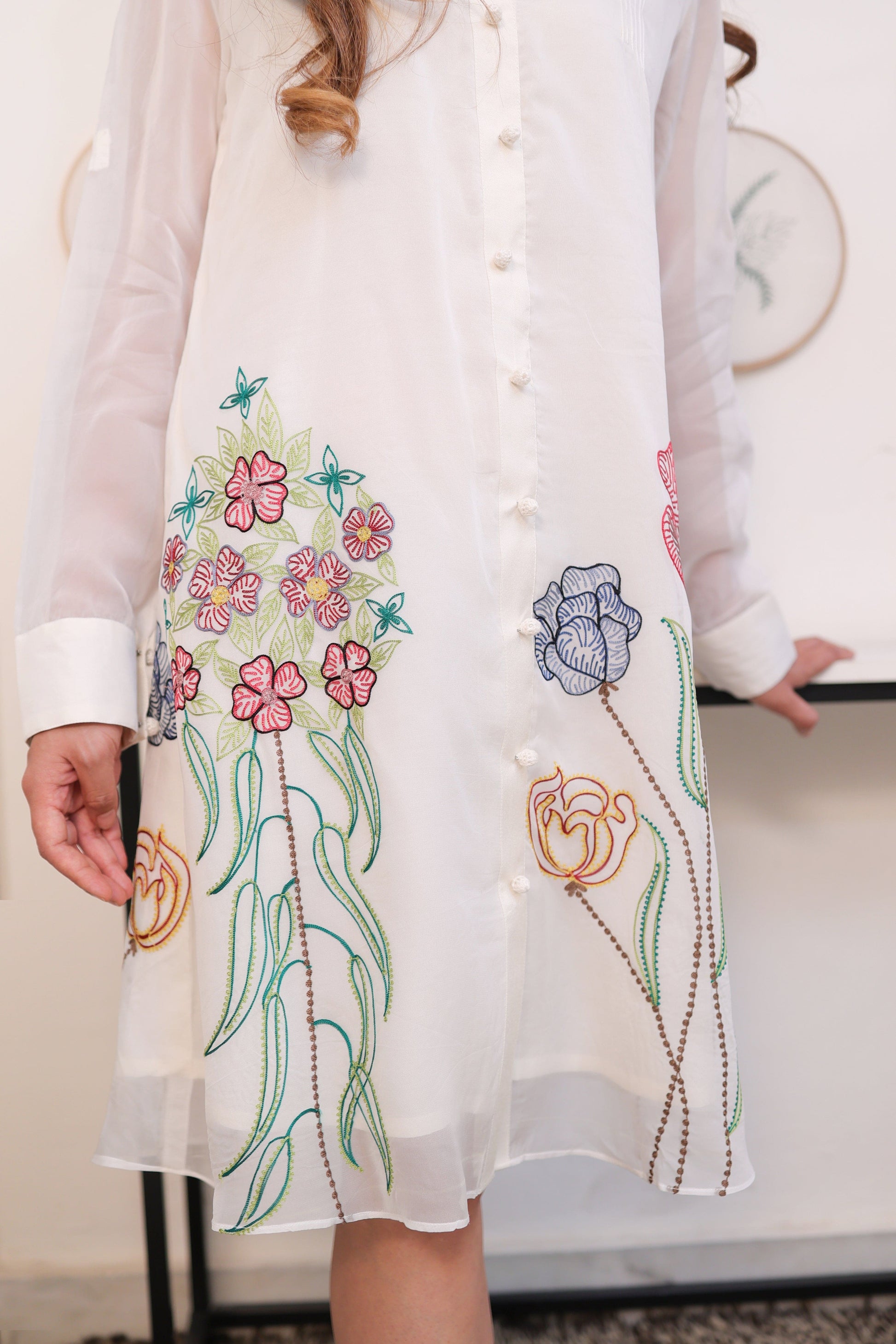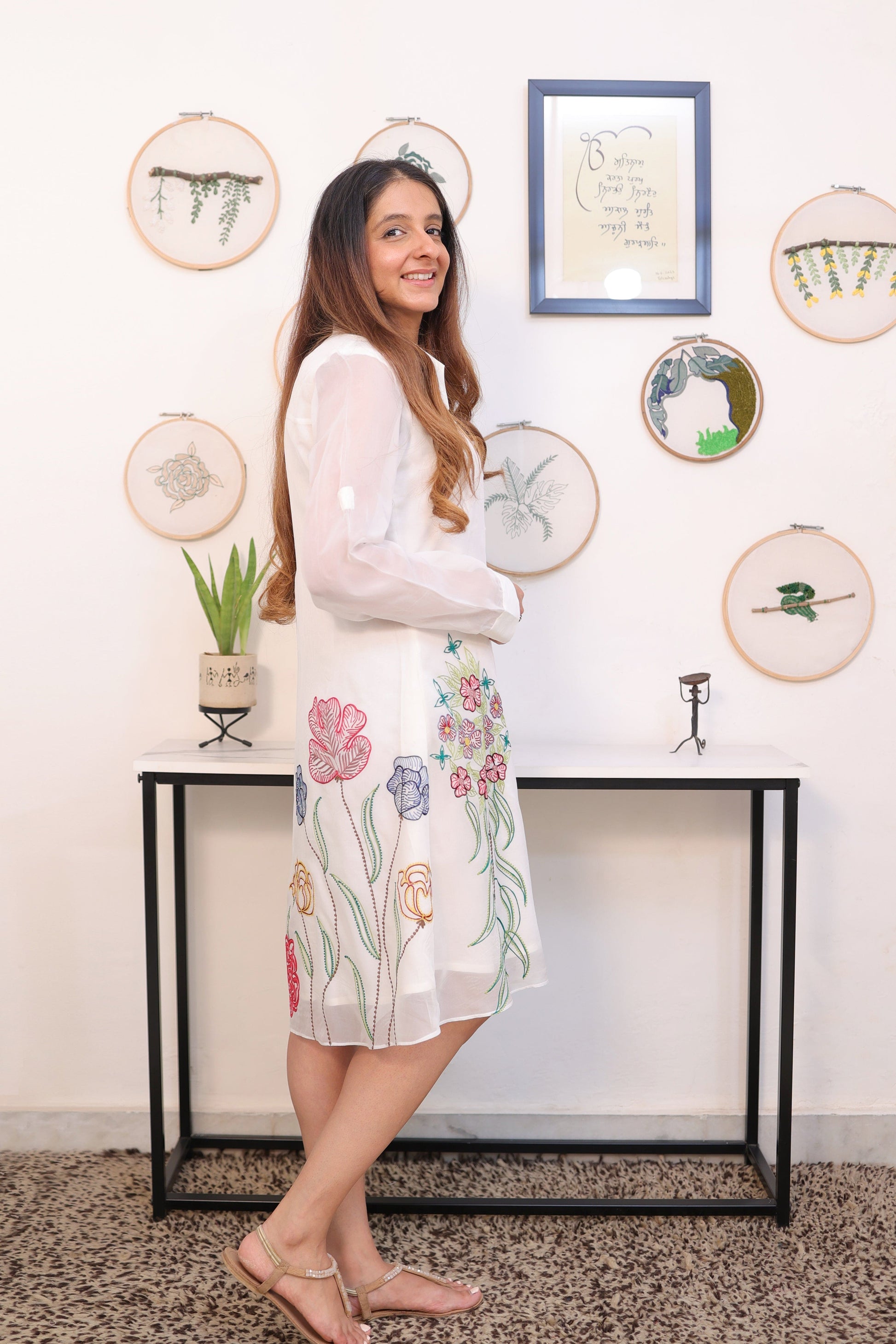 Off White organza knee length dress with multi coloured embroidery on front and back