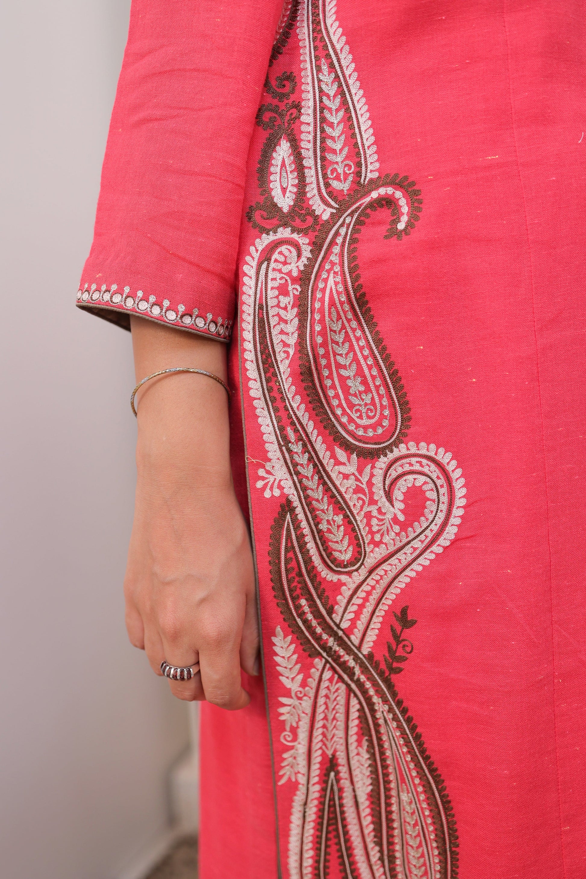 Hot pink linen Paisley Embroidered Suit