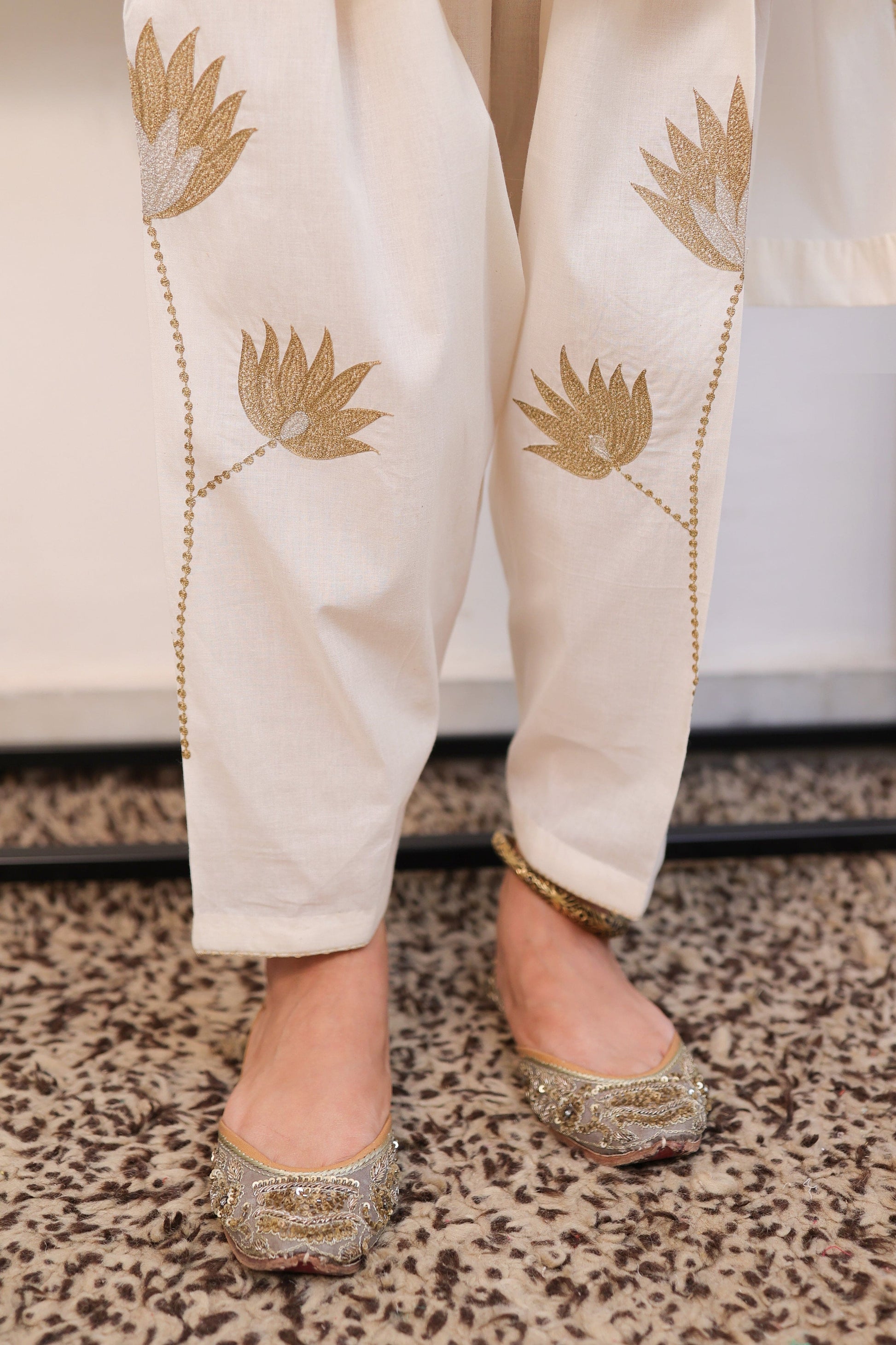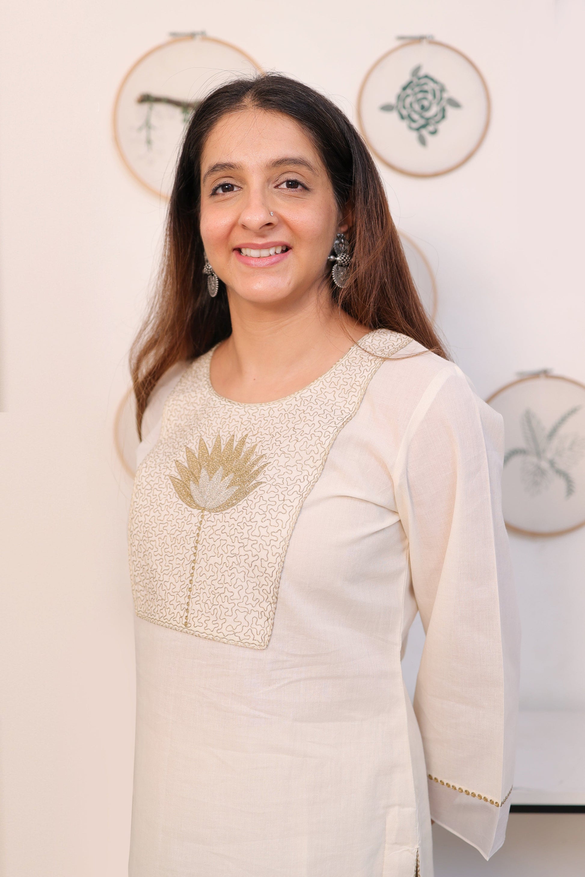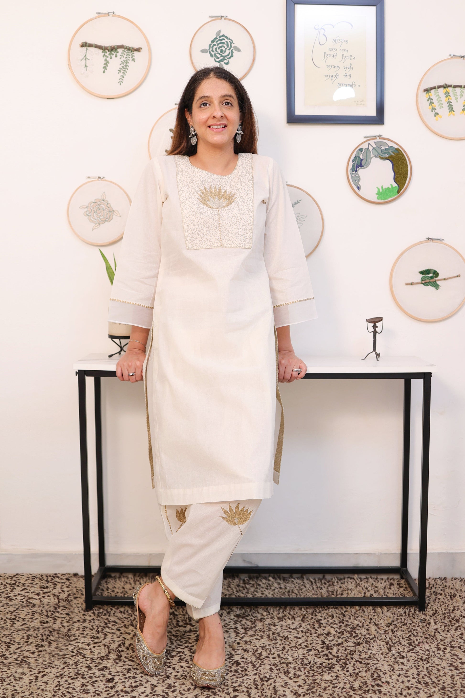 Off-White kora Cotton floral embroidery kurta with golden and silver zari